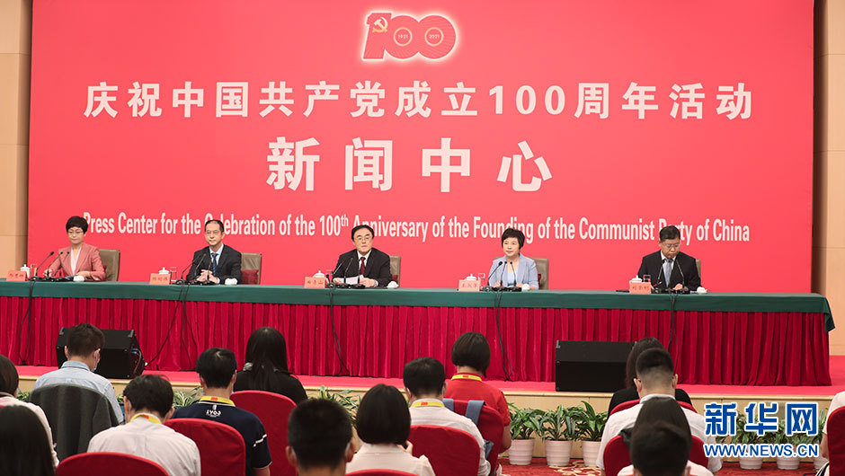 6月27日,庆祝中国共产党成立100周年活动新闻中心举办新闻发布会,中央党史和文献研究院院长曲青山、第三研究部主任姜淑萍、对外合作交流局局长杨明伟、第七研究部副主任刘荣刚介绍新时代党史和文献工作。图为新闻发布会现场。新华网 陈杰 摄