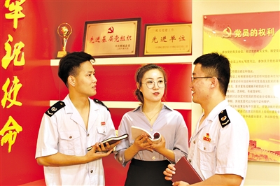 ▲税务干部在“党建园地”交流思想,切磋技艺。资料照片