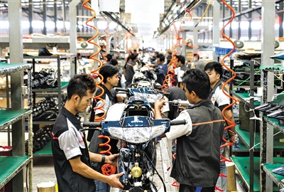 ▲工人在云南自贸区德宏片区摩托车产业园工作。新华社发(陈欣波 摄)