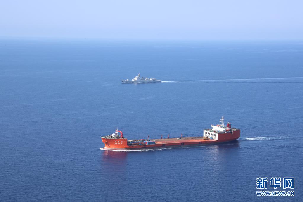 中国海军第37批护航编队长沙舰(后)为中国“振华28号”商船伴随护航(5月28日摄)。新华社发(王健 摄)