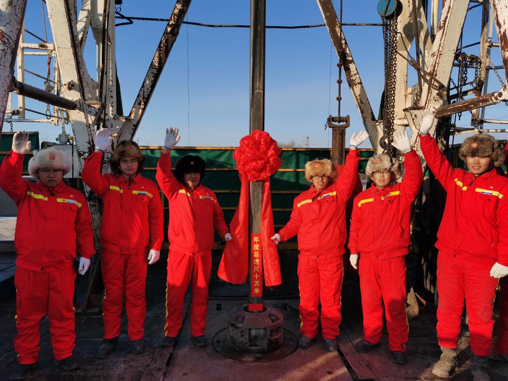 2020年12月24日,大庆油田1205钻井队庆祝今年累计进尺突破10万米,历史累计进尺相当于钻透了355座珠穆朗玛峰。新华社发