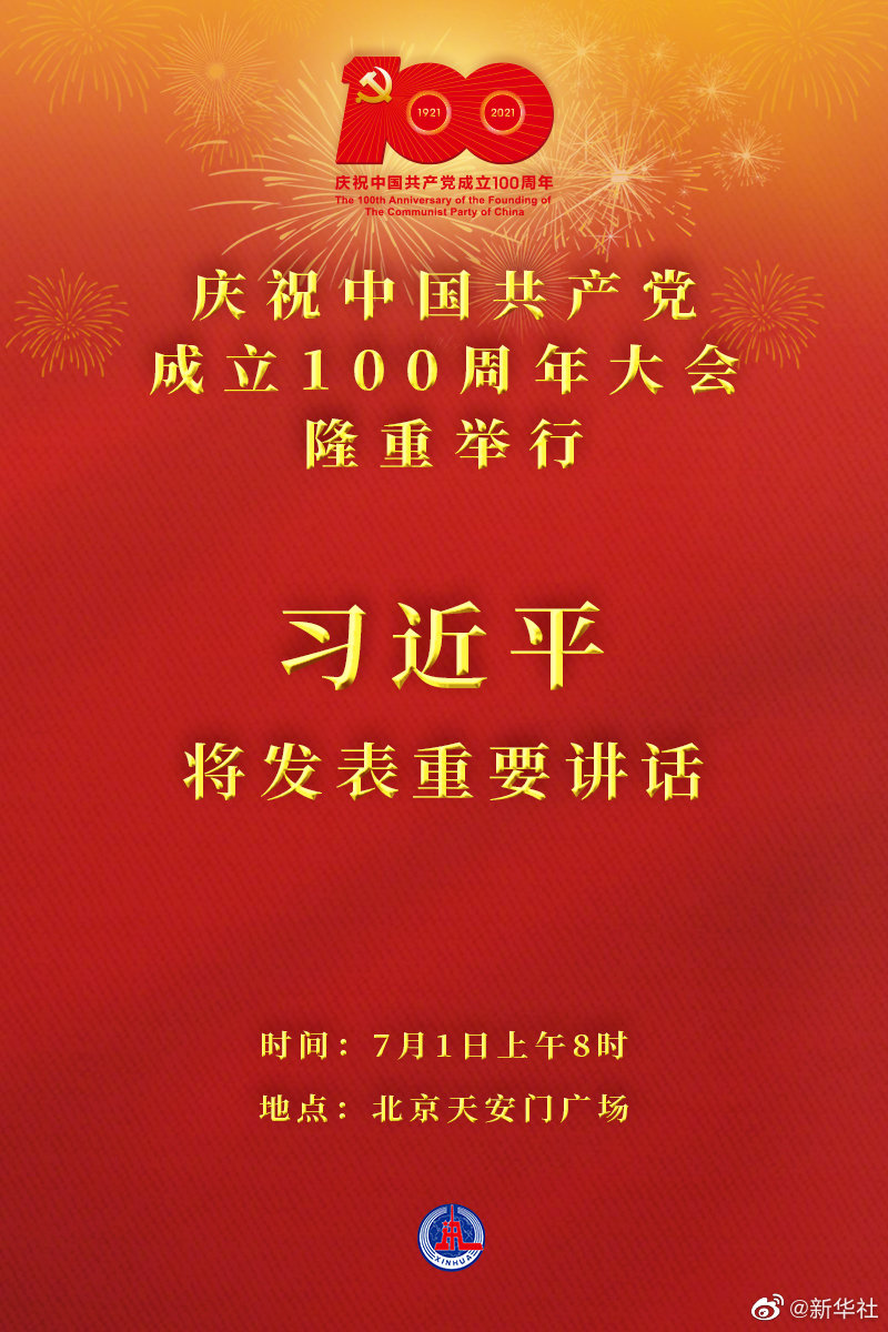 庆祝中国共产党成立100周年大会7月1日上午8时在北京天安门广场隆重举行。中共中央总书记、国家主席、中央军委主席习近平将发表重要讲话。