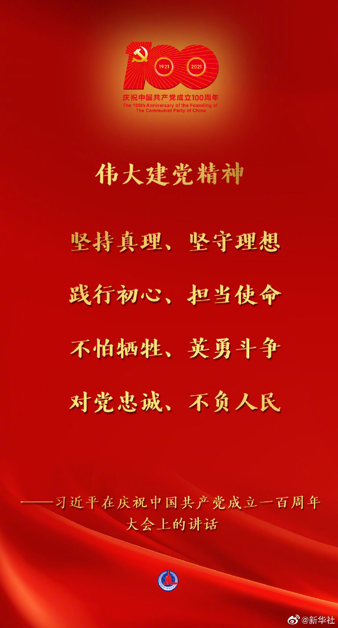 习近平说,一百年前,中国共产党的先驱们创建了中国共产党,形成了坚持真理、坚守理想,践行初心、担当使命,不怕牺牲、英勇斗争,对党忠诚、不负人民的伟大建党精神,这是中国共产党的精神之源。