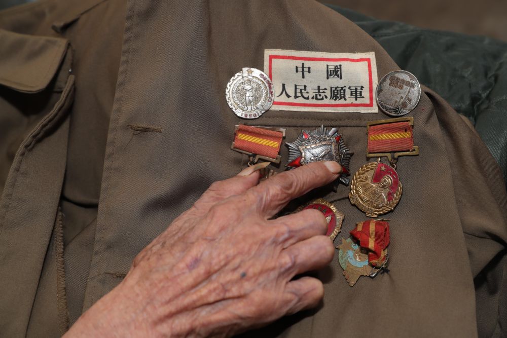 当记者再回头望向老人时,时年96岁、身材瘦弱的他已经在家人的搀扶下坐起,用力挺直佝偻的腰背,脸上挂着微笑。在他的身旁,整齐叠放着一件挂着军功章的志愿军军装。