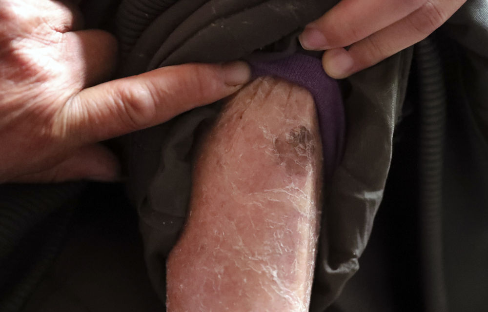 ↑在辽宁省丹东市,志愿军老战士孙景坤展示腿上的伤疤,他身上共有20多处伤疤(7月7日摄)。新华社记者杨青摄