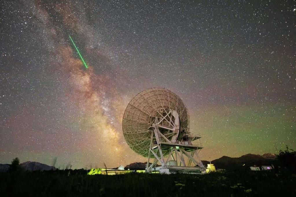 新疆天文爱好者王金辉2021年6月16日在中科院新疆天文台拍摄的银河和“墨子号”卫星(绿色轨迹)。(星联CSVA供图)