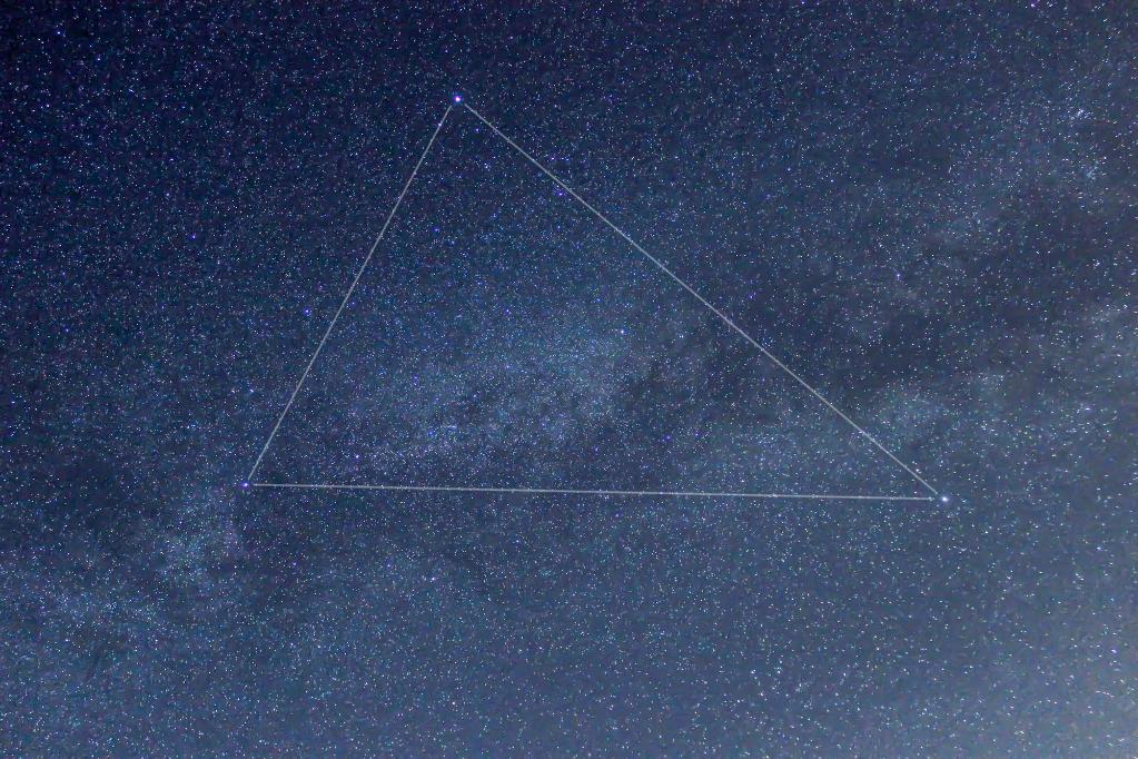 向东边的高空望去,最醒目的是三颗1等亮星:天琴座的织女星、天鹅座的天津四和天鹰座的牛郎星,它们组成了一个近似直角的巨大三角形,称为“夏季大三角”。