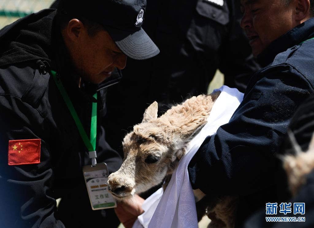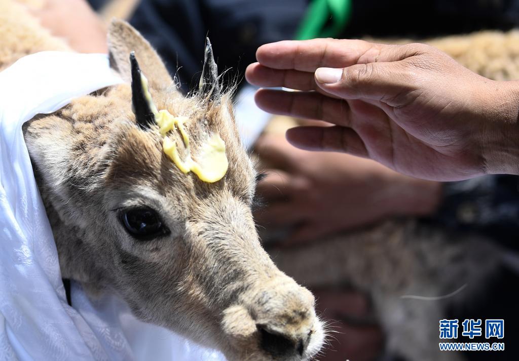 7月7日,在可可西里索南达杰保护站野生动物救助中心,可可西里巡山队员按照风俗为放归的藏羚羊戴上哈达表达祝福。新华社记者 张龙 摄
