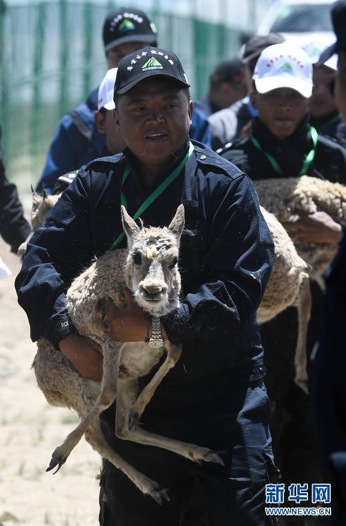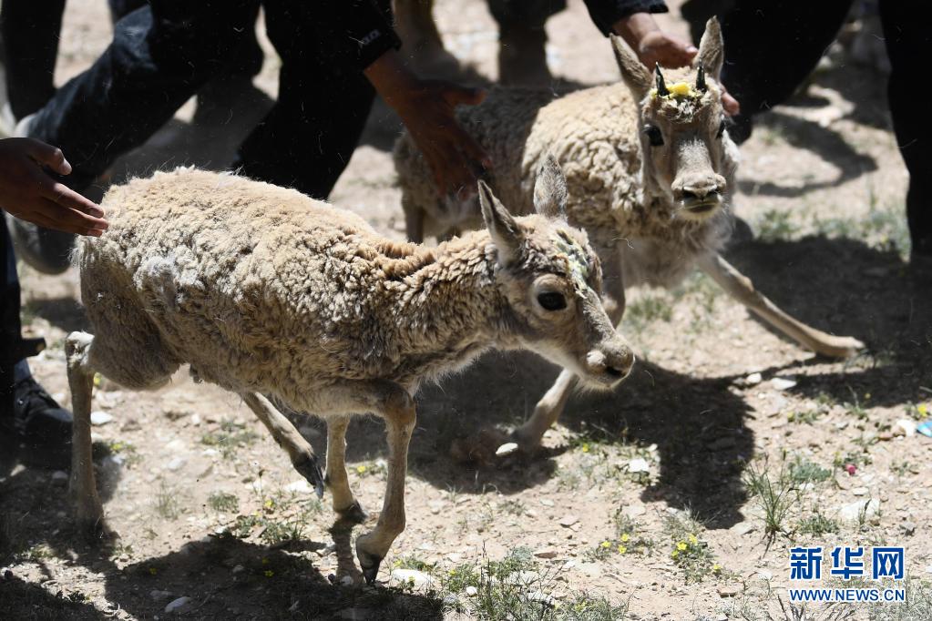 7月7日,在可可西里索南达杰保护站野生动物救助中心,藏羚羊被放归大自然。新华社记者 张龙 摄