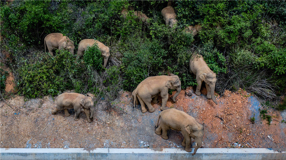 5月28日在云南省玉溪市峨山县境内拍摄的象群(无人机照片)。新华社记者 胡超 摄