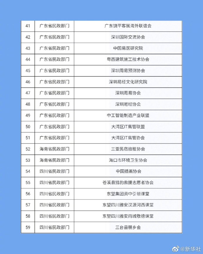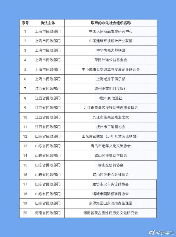 民政部8日公布第六批地方民政部门近年来依法取缔的部分非法社会组织名单,包括中华陶瓷大师联盟等59家非法社会组织。民政部提示,社会公众如果发现名单中的非法社会组织仍在开展活动的,可依法向公安机关报案。谨防上当!(记者高蕾)