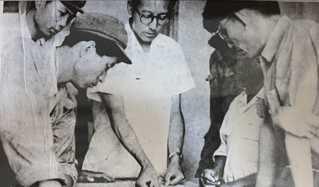 年轻时的刘志祥(左二)和同事讨论。(采访对象供图)