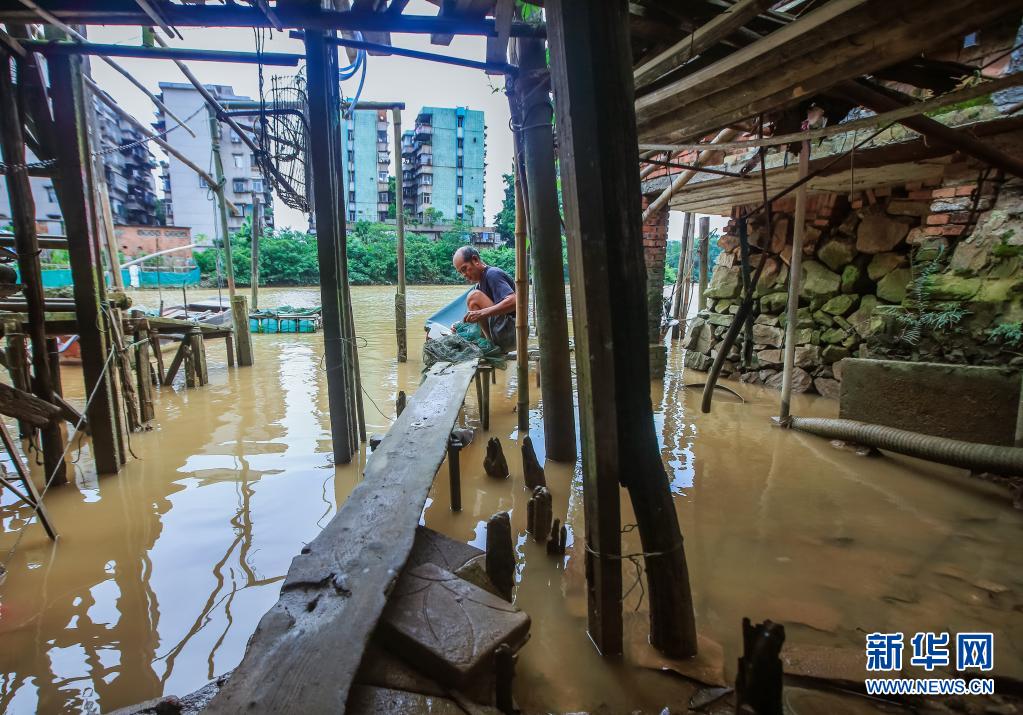 居民在改造前的广东省江门市下沙片区棚户区的吊脚楼修补渔网(资料照片)。新华社发