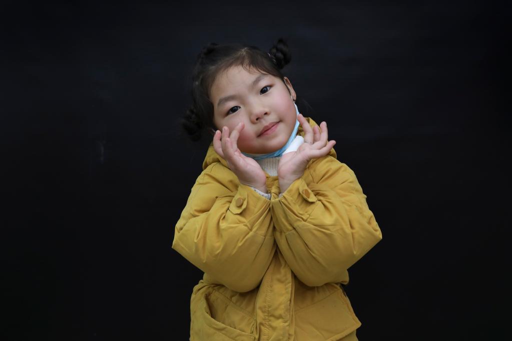 五岁的涵涵(化名)一脸兴奋地跑到黑色背景布前,双手托着下巴,笑容灿烂地注视着杨科跃的镜头。