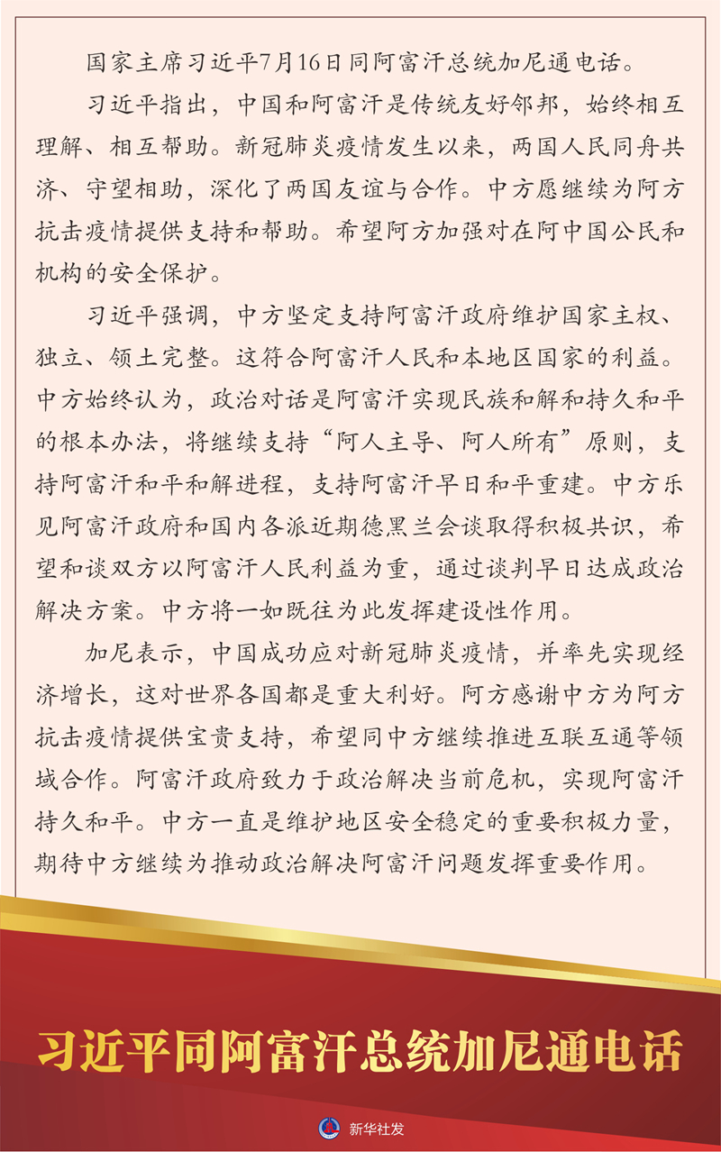新华社北京7月16日电 国家主席习近平7月16日同阿富汗总统加尼通电话。