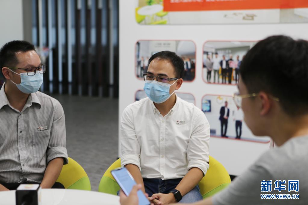 在广东中山,粤港澳创业服务平台“工合空间”的创始人叶兴华(中)接受采访(7月14日摄)。新华社记者 耿馨宁 摄