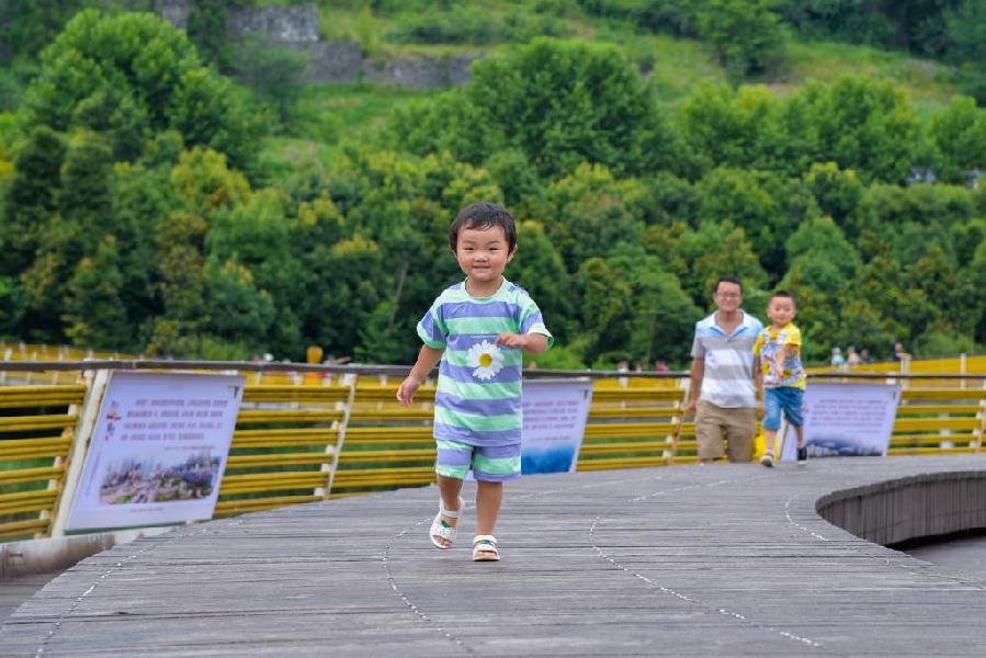 游人在贵州六盘水明湖国家湿地公园内游玩(7月16日摄)。新华社记者徐钦摄