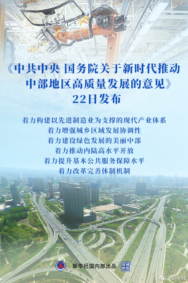 《中共中央 国务院关于新时代推动中部地区高质量发展的意见》22日发布,提出着力构建以先进制造业为支撑的现代产业体系,着力增强城乡区域发展协调性,着力建设绿色发展的美丽中部,着力推动内陆高水平开放,着力提升基本公共服务保障水平,着力改革完善体制机制,推动中部地区加快崛起,在全面建设社会主义现代化国家新征程中作出更大贡献。(记者安蓓、魏玉坤,海报设计杨轶群)