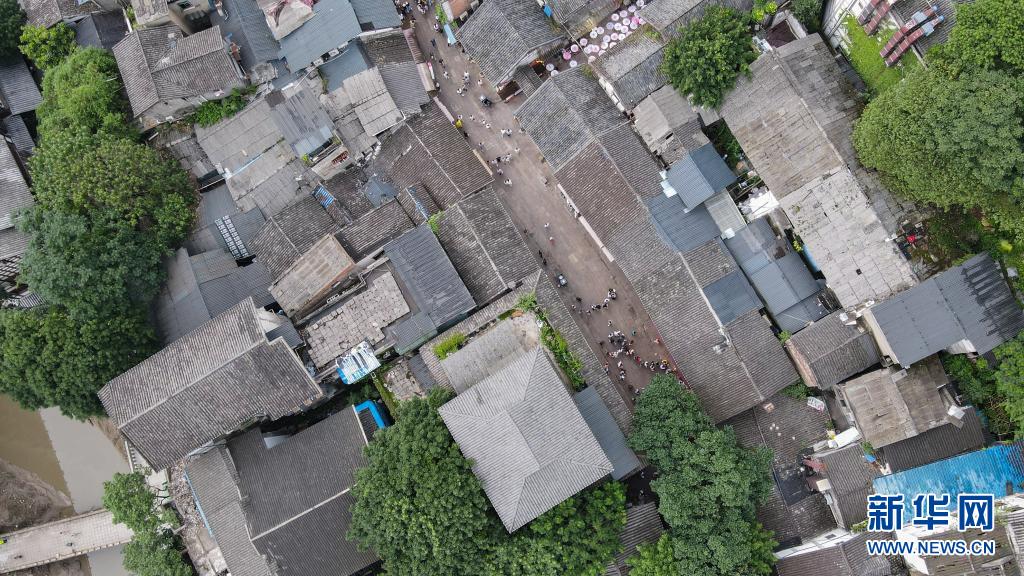 游客在重庆磁器口古镇游览(7月21日摄,无人机照片)。新华社记者 徐钦 摄