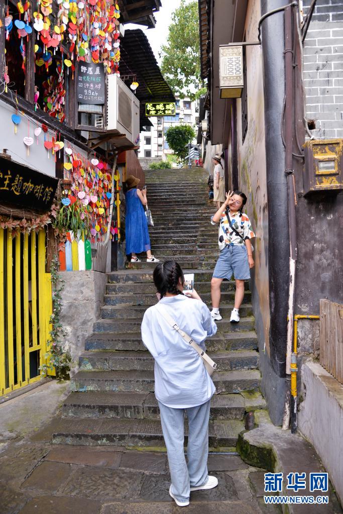 游客在重庆磁器口古镇拍照(7月21日摄)。新华社记者 徐钦 摄