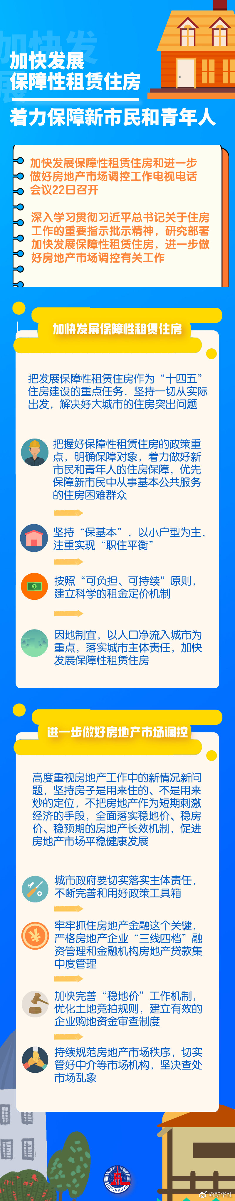 加快发展保障性租赁住房和进一步做好房地产市场调控工作电视电话会议22日召开,部署加快发展保障性租赁住房,着力做好新市民和青年人的住房保障,以小户型为主,注重实现“职住平衡”,建立科学的租金定价机制。会议还要求进一步做好房地产市场调控,坚持房子是用来住的、不是用来炒的定位,不把房地产作为短期刺激经济的手段。(记者戴小河,制图吴昊)