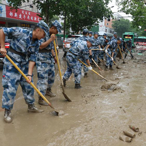 空军航空兵某旅官兵在郑州市东明路与顺河路区域清理道路淤泥(7月23日摄)。新华社发(完备 摄)