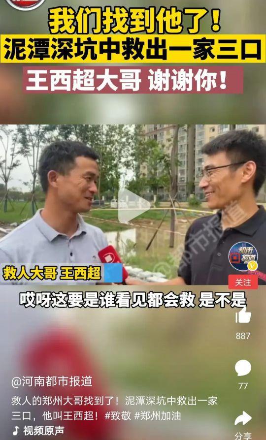 他叫王西超,郑州一名普通的市民。7月20日,一位妈妈带着两个孩子,通过一个积水点时,一不小心掉入一个泥潭中,当时洪水已经快漫过头顶,情况非常危险。这时带着女儿刚好路过的王西超看见这种情况,丝毫没有犹豫,向母女三人伸出援助之手,将三人救出。母女获救后,他默默地离开了。之后,大家都在寻找这个好心人,找到之后,他面对记者时说到:这只是举手之劳,谁看见都会救。