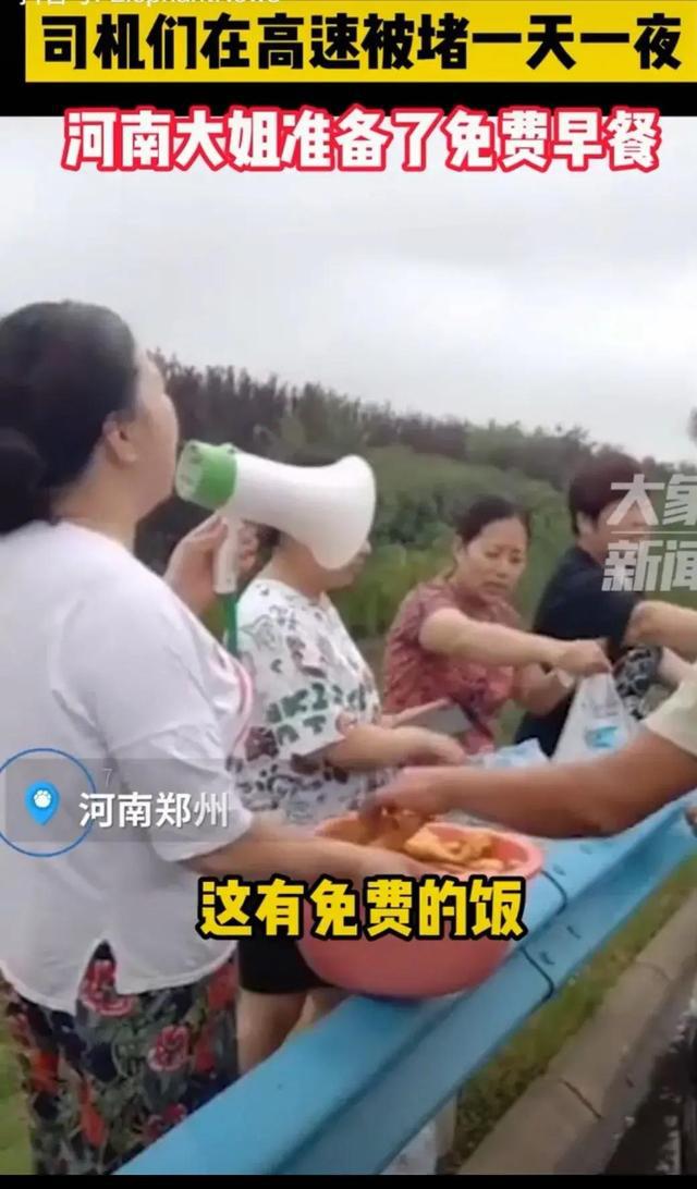 高速公路上,一位河南大姐带着自己做好的油条和热水,免费给被堵的车主和乘客。