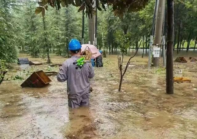 这是国网郑州供电公司员工趟着齐腰深的积水紧急抢修供电设施。