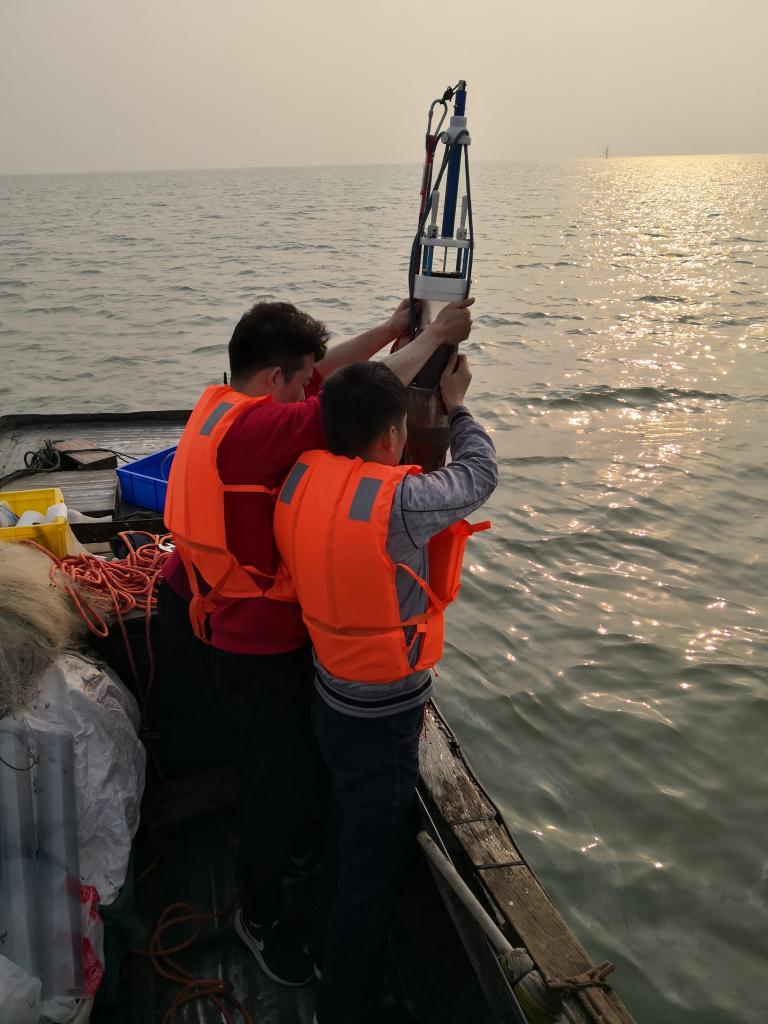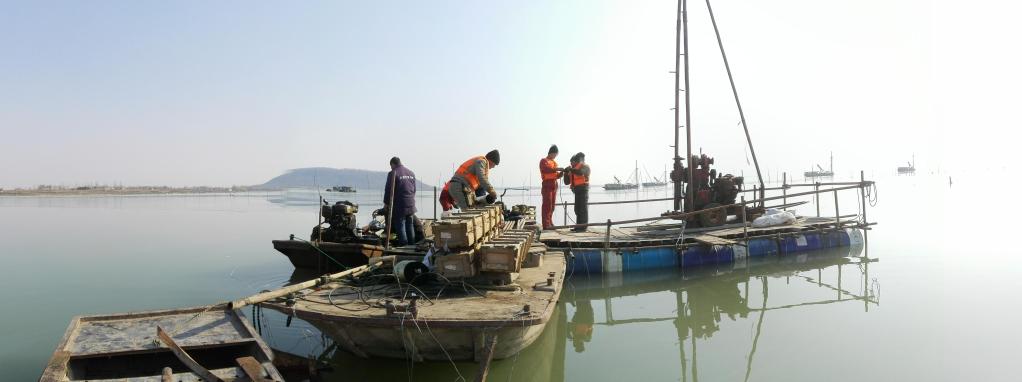 科研人员在女山湖采集顶部沉积物。(受访单位供图)