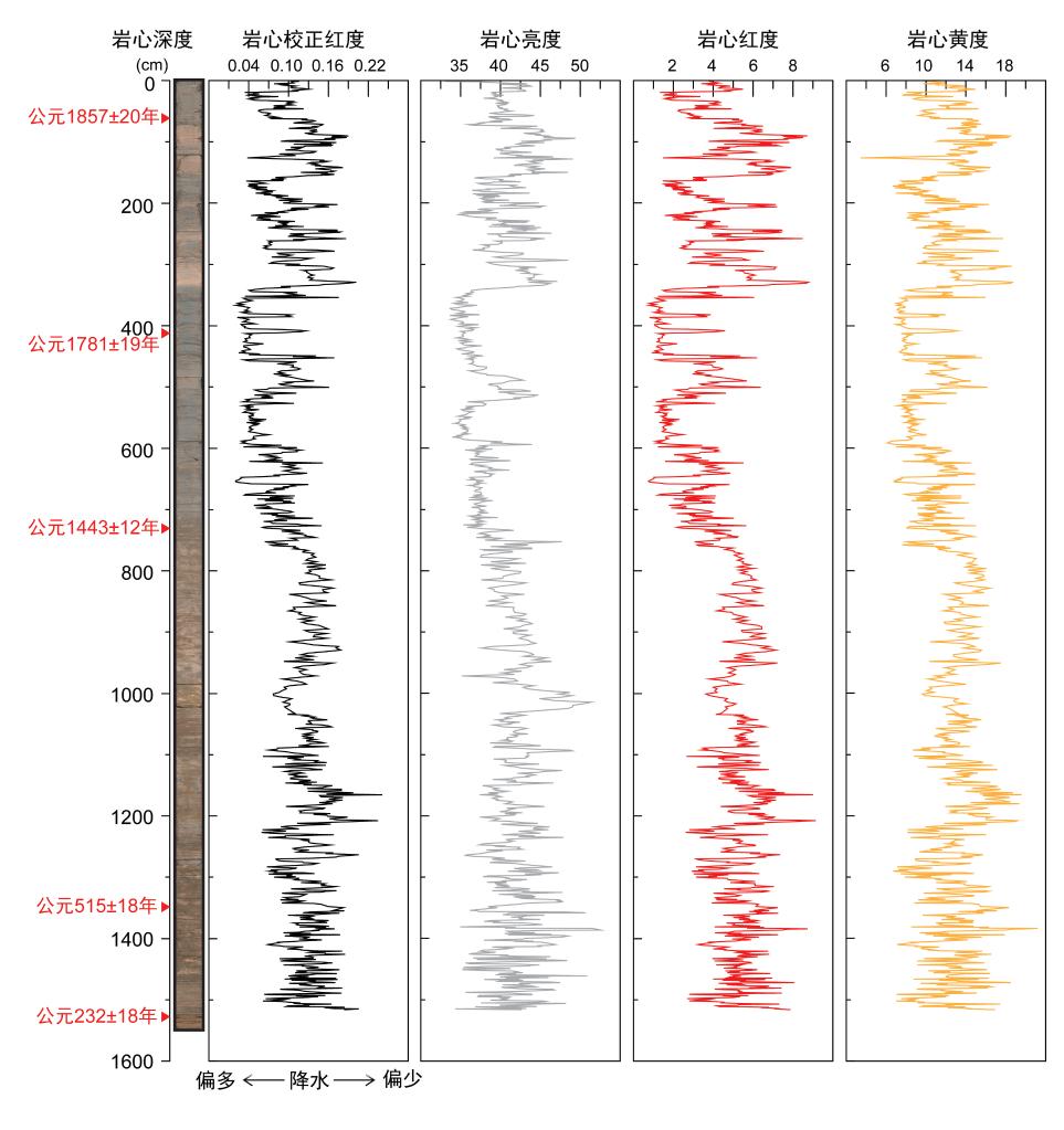 女山湖沉积物岩心特征及颜色指示的年代降水变化。(受访单位供图)