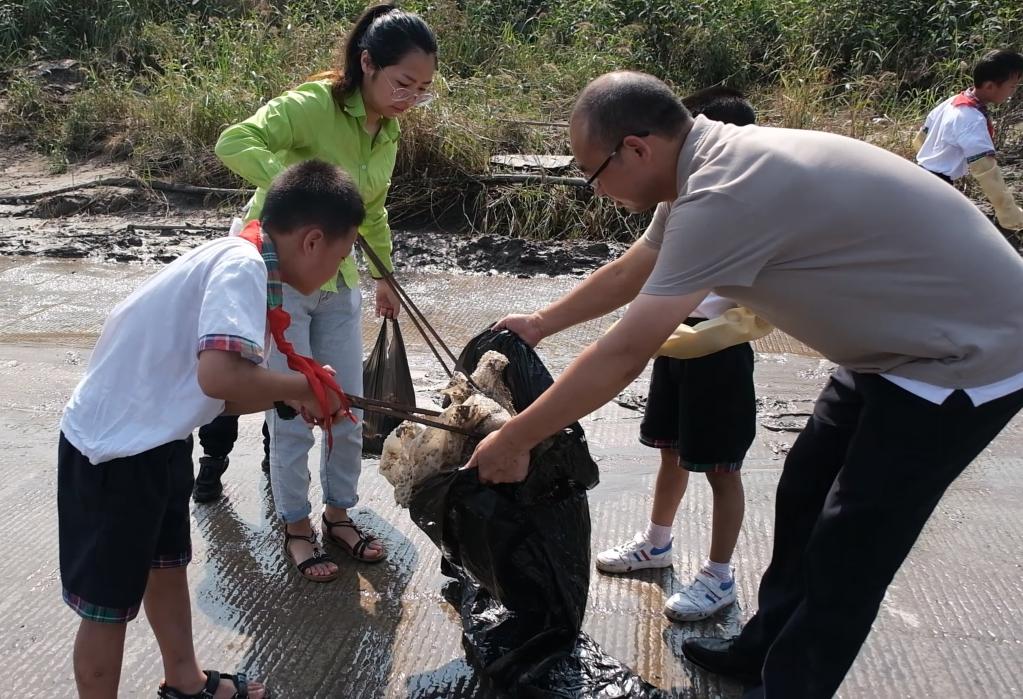 图为老师和“红领巾”一起捡拾垃圾。(孔繁璐 摄)
