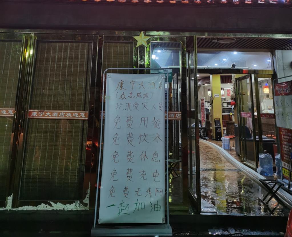 进去后才发现,这家酒店的老板用自备的发电机发电,支起大锅,给救援人员煮面条。“抗汛受灾人员,免费用餐、免费饮水、免费休息、免费充电、免费无线网,一起加油。”门口一连“5个免费”的牌子格外醒目。