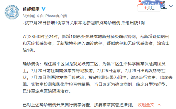 确诊病例:现住昌平区回龙观龙跃苑二区,为昌平区生命科学园某保险集团员工。7月20日前往湖南张家界等地旅游,7月25日返京,7月26日出现发热等症状。7月28日到医院发热门诊就诊,核酸检测结果为阳性,综合流行病史、临床表现、实验室检测和影像学检查等结果,当日诊断为确诊病例,临床分型为轻型,已转至定点医院隔离治疗。