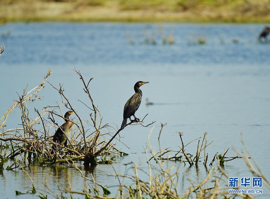 两只鸬鹚在乌伦古湖国家湿地公园休憩(7月17日摄)。新华社记者 侯昭康 摄