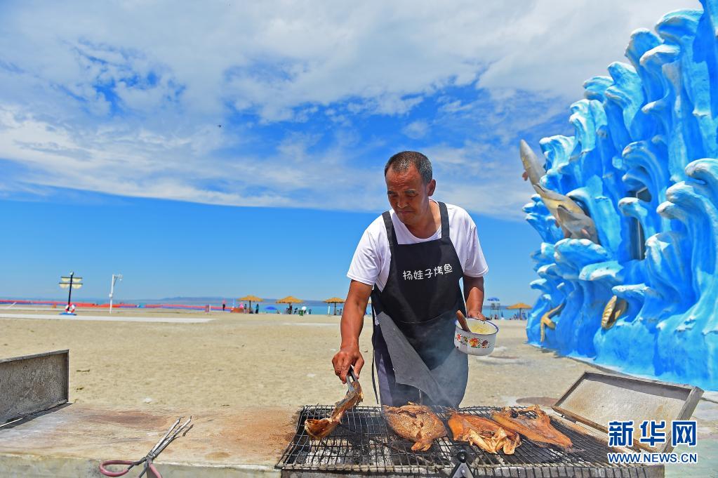 进入七月,乌伦古湖东北岸的黄金海岸景区门前车来车往,这里沿岸近100米的天然浅水滩吸引了不少游客来体验“福海”戏浪,烤鱼店老板杨廷忠也迎来了他一年中最忙碌的时节。
