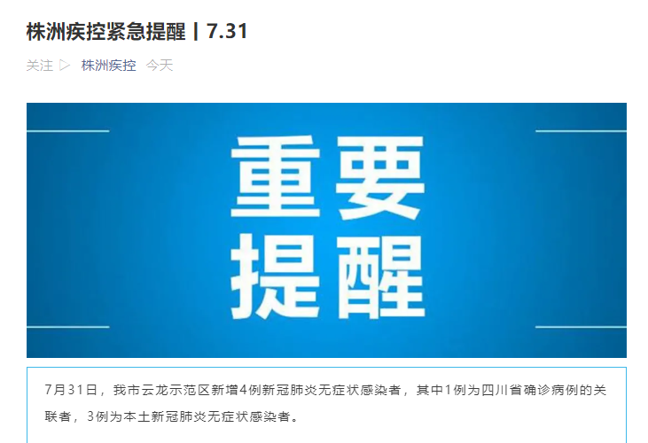 7月31日,株洲市云龙示范区新增4例新冠肺炎无症状感染者,其中1例为四川省确诊病例的关联者,3例为本土新冠肺炎无症状感染者。
