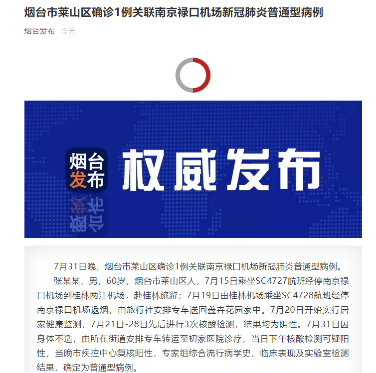 7月31日晚,烟台市莱山区确诊1例关联南京禄口机场新冠肺炎普通型病例。