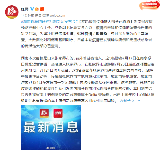 湖南本次疫情是由来张家界市的3名外省游客输入,这3名游客7月17日在南京禄口机场短暂停留,当晚进入张家界市,在张家界市旅游到7月23日后抵达湘西自治州凤凰县,7月24日离开我省。这3名游客在张家界市通过酒店内共同早餐、旅游中聚集性活动等,传播给张家界市本地导游和北京市、成都市等地游客。成都市游客7月24日在常德市一封闭游船上再次传播给众多同乘者。这些游客、导游再通过密切接触和聚集性活动引发国内部分省市和我省部分市州的传播。基因测序结果表明我省本土病例感染的新冠病毒属于Delta 变异株,已由中国疾控中心确认与近期江苏省报送的本土病例新冠病毒基因组序列高度同源。