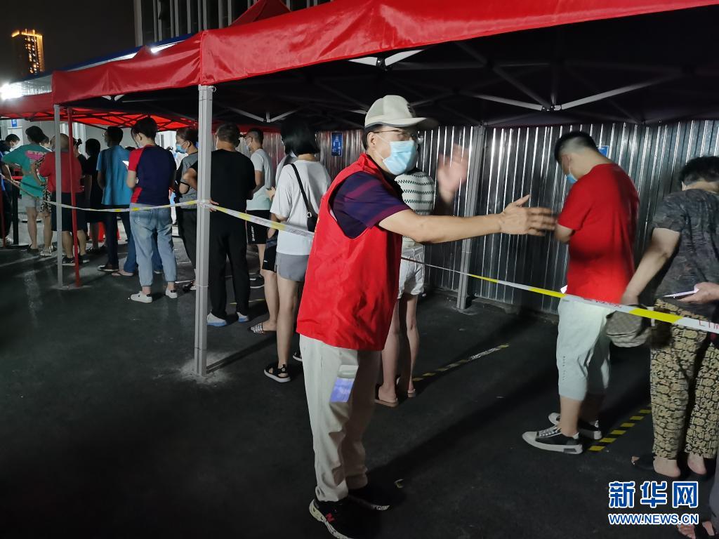 8月3日,志愿者张元照在武汉市汉阳区龙阳社区卫生服务中心核酸采样点维持秩序。新华社记者 田中全 摄