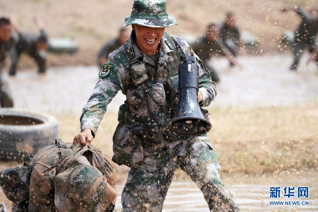 陆军第76集团军某特战旅特战营营长刘近组织特战队员进行泥潭摔擒训练(7月14日摄)。新华社记者张永进摄