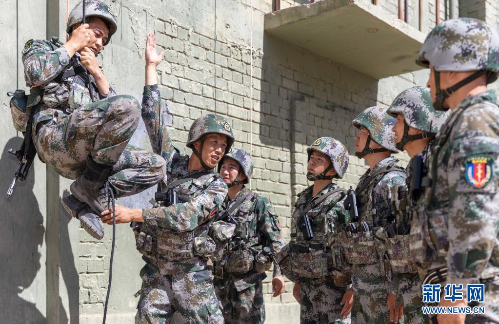陆军第76集团军某特战旅特战营营长刘近(左二)为战士讲解攀登动作要领(7月7日摄)。新华社发(陈浩 摄)