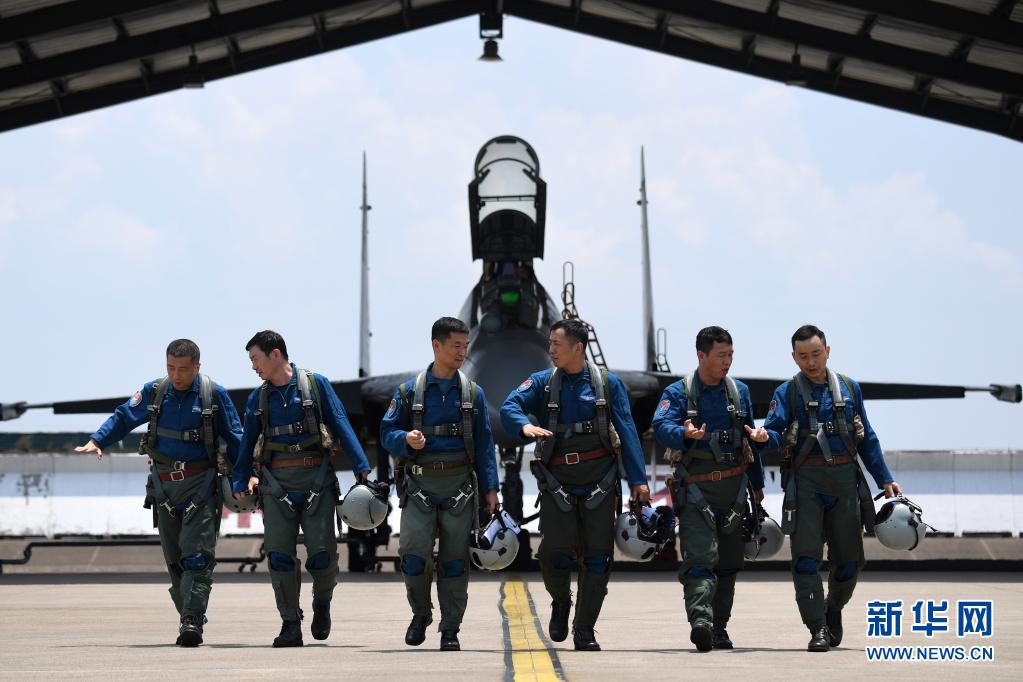 飞行训练结束后,邱麟辉(右三)和队友交流空战体会(2021年7月19日摄)。新华社发(余红春 摄)