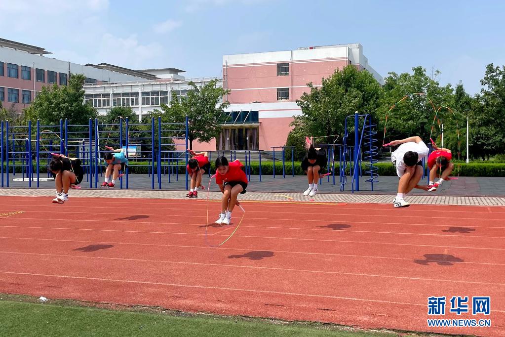 7月24日,在山东省淄博市周村区城北中学,天绳健跳绳队队员在操场上训练。新华社记者 陈国峰 摄