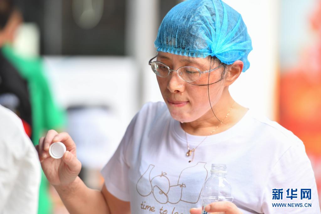 市民徐勇(右一)在检测后为她扇扇子