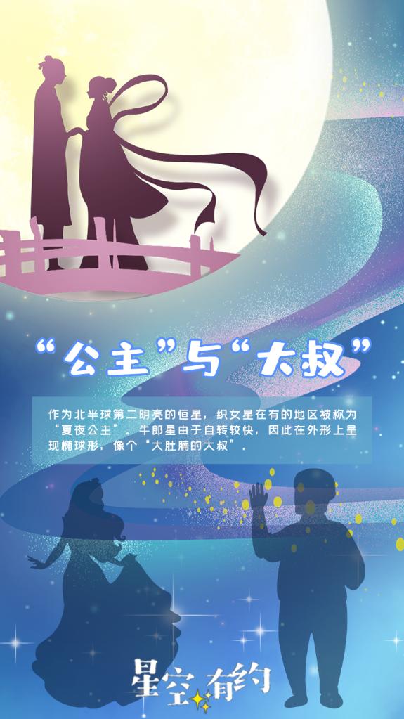 作为北半球第二明亮的恒星,织女星在有的地区被称为“夏夜公主”。织女星周边有四颗小的恒星,排列的形状有点像菱形,被看作是“织布的梭子”。牛郎星由于自转较快,因此在外形上呈现椭球形,像个“大肚腩的大叔”。作为天琴座的主星,织女星在银河的“西岸”,而作为天鹰座的主星,牛郎星在银河的“东岸”,两颗星隔“河”相望。