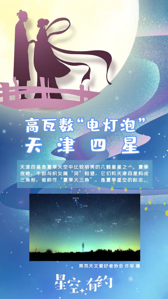 仰望夏季夜空,见证牛郎星和织女星“异地恋”的,有一个“超级电灯泡”天津四星。天津四星是天鹅座的主星,传说是天帝过银河的渡口,因此得名“天津”。天津四星是夏季天空中比较明亮的几颗星星之一,它和牛郎星、织女星在夏夜的天空中构成一个三角形,被称作“夏季大三角”,是夏季星空的标志。