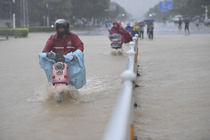 8月6日,在福州市晋安区福兴大道附近,一名快递员涉水出行。新华社记者 宋为伟 摄