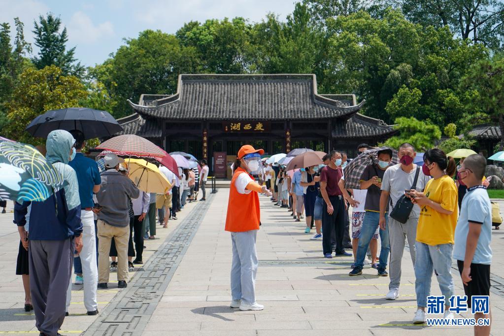 市民在扬州市瘦西湖街道五亭社区瘦西湖西门采样点排队,准备进行核酸检测(8月7日摄)。新华社记者 李博 摄