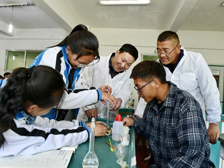 △西藏山南市第一高级中学,学生们正在老师的指导下做化学实验。